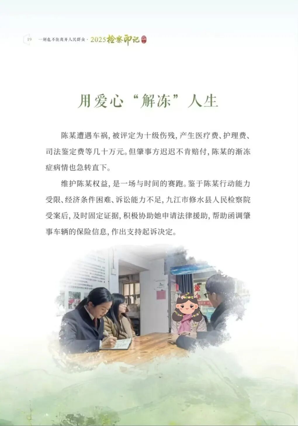 近日,“江西检察”微信公众号发布专题栏目“【云书】检察印记”,集中展示省两会期间江西检察机关向全省人民汇报的亮点工作。其中,包括修水县检察院办理的陈某支持起诉案。